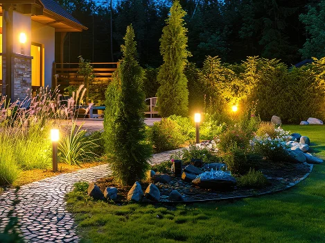 Enhance your yard with elegant lighting that highlights trees, walkways, and architectural features using warm, efficient LED fixtures.